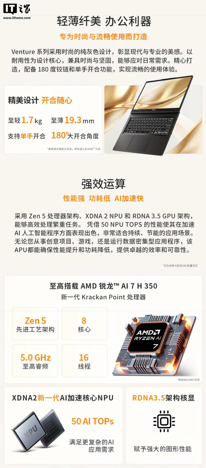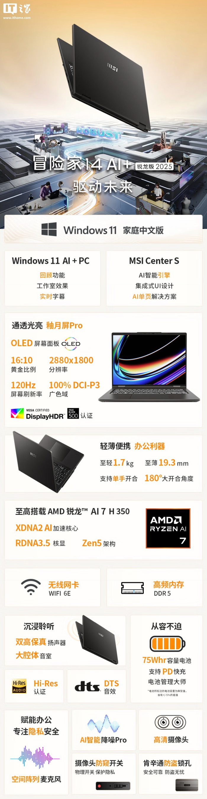 2025 款微星冒险家 14 AI+ 锐龙版笔记本上市:AI 7 H 350 + 16G + 512G 售 6999 元