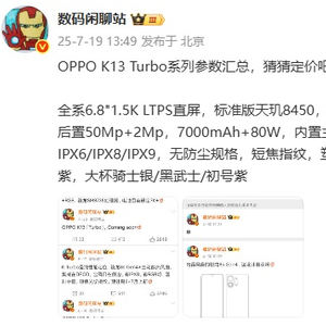 IT之家 7 月 19 日消息,OPPO K13 Turbo 系列将于 7 月 21 日 14:30 发布,博主 @数码闲聊站 今日发布这款新机的主要参数。