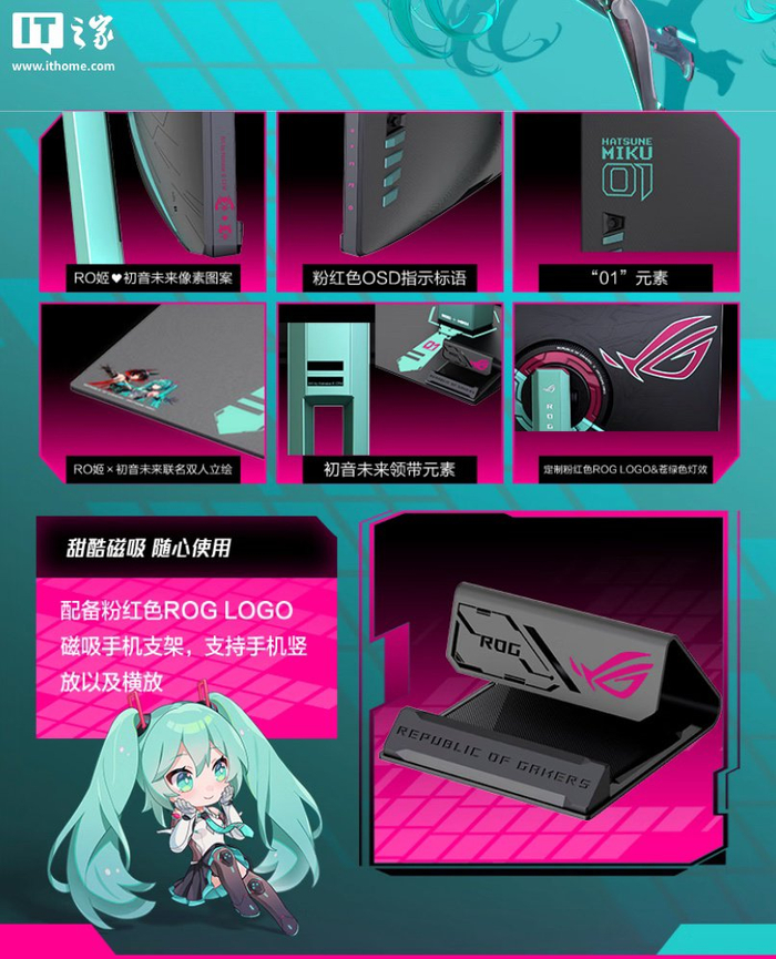 该机提供定制粉红色 ROG Logo,外壳带有 RO 姬 x 初音未来、初音 01 等图案,附带 ROG Logo 手机磁吸支架。