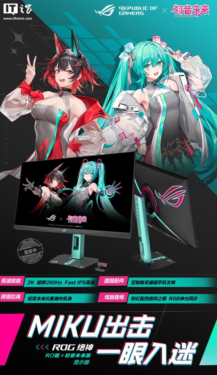 IT之家 7 月 19 日消息,华硕 ROG 与初音未来 IP 联名的“XG27ACMEG-R”27 英寸显示器现已在京东上架,该机提供定制外壳 / 支架 / OSD 菜单,同时赠送限定初音闪卡,显示器核心配置为 2K 260Hz 超频,定价为 2199 元,将于 8 月 30 日开售