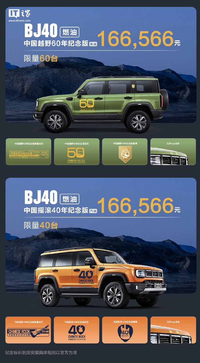 IT之家 7 月 19 日消息,北京越野宣布旗下 2026 款北京越野 BJ40 燃油版上市,系列车型提供标准版、进阶版、柴油版三种款型及越野 60 年特别版和摇滚 40 年纪念版两款特别版,其中越野 60 年特别版限量 60 辆,摇滚 40 年纪念版限量 40 辆,官方指导价为 14.99 万元起,焕新价 12.69 万元起。