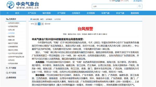 快科技7月20日消息,据中央气象台,今年第6号台风“韦帕”已于19日夜间加强为台风级,今天早晨5点其中心位于广东省珠海市东偏南方约190公里的广东近海海面上。