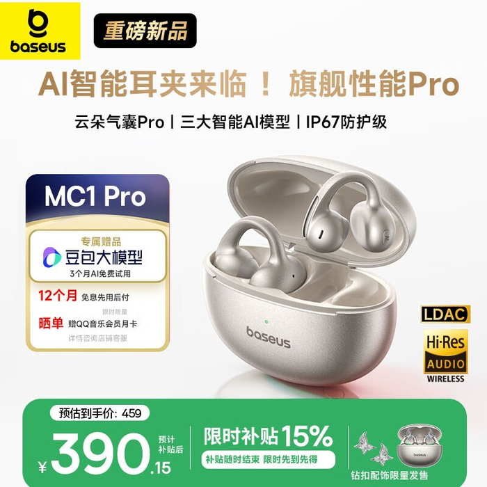 倍思MC1 Pro AI骨传导蓝牙耳机京东优惠价390元