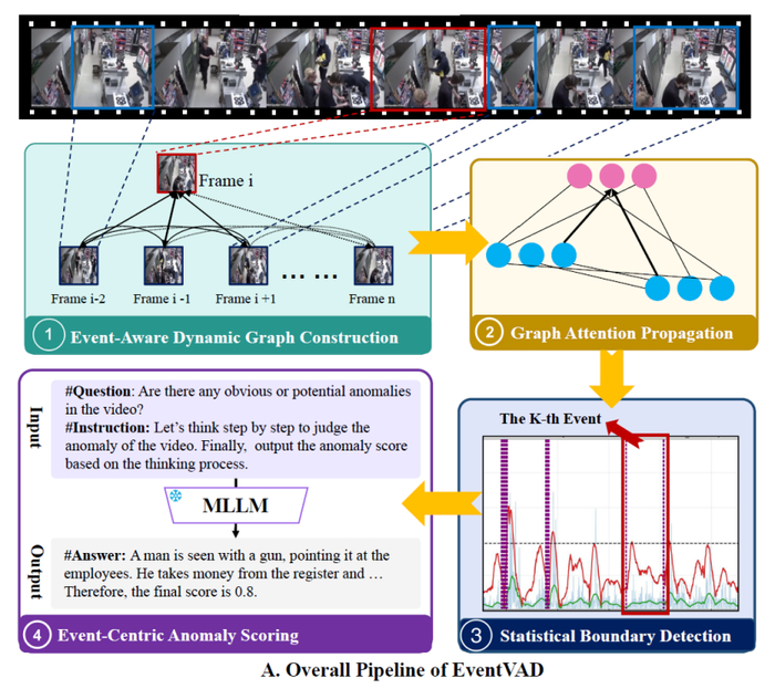 EventVAD 的整体框架包含四个核心模块:事件感知动态图构建、图注意力传播、统计边界检测和事件中心异常评分。通过这一流程,实现了从视频帧特征提取到异常帧精准定位的端到端无需训练检测。