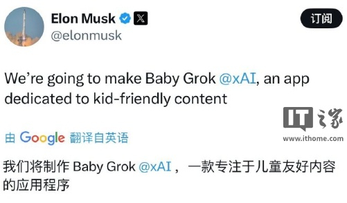 IT之家 7 月 20 日消息,马斯克今日通过社交平台 X 宣布,其人工智能公司 xAI 将开发一款专为儿童设计的应用“Baby Grok”。马斯克未透露“Baby Grok”的具体功能细节,仅表示该应用将为儿童提供“友好型内容”。