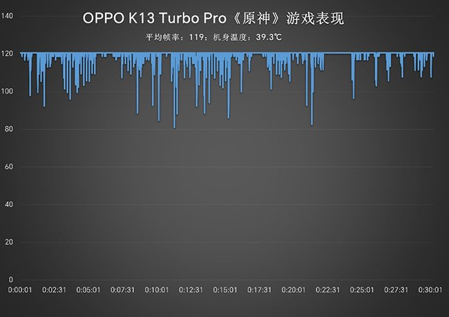 高负载的原神也不怕!OPPO K13 Turbo Pro通过GPU实现了超分超帧。测试全程开启超级帧率半小时原神全特效平均119帧,机身最高温39.3℃。相比普通60帧模式,超帧之后画面流畅度直接翻倍,温度也比之前更低!