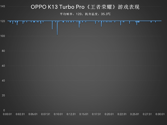 重点看游戏表现,王者荣耀半小时全特效拉满,全程稳120帧!主动散热也确实顶,手机背面温度才35.3℃,摸起来温温的完全不烫,比不少对手都凉快,中负载游戏对它来说小菜一碟。