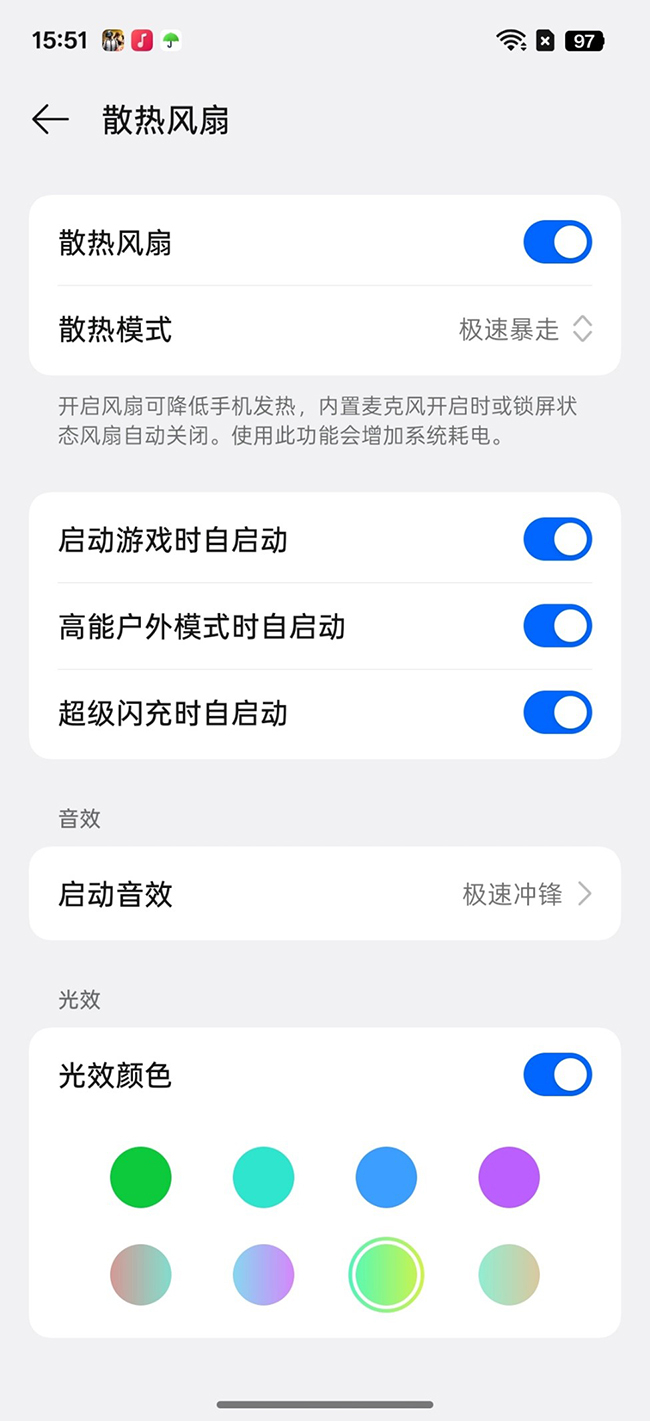镜头模组设计挺贴心,不管是横竖握,打游戏都不硌手。但我们今天要重点说的是OPPO K13 Turbo Pro的散热,它首发了“疾风散热引擎”,在OPPO手机上首次使用主动散热!主摄旁边塞进了一个转速高达18000转/分钟的风扇,散热鳍片足足有13片且厚度仅为0.1毫米,在系统设置中可以改变风扇转速和灯效颜色,配合专门设计的L型低风阻风道和弧形涡舌,可以高效顺畅地吹走热量,散热效率更高。