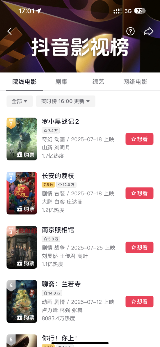 从抖音App可以看到,在抖音院线电影榜中,可以选择查看的电影类型分为“全部”、“热映”和“待映”,时间可以选择“周榜”、“日榜”和“实时榜”。从评分体验来看,抖音上的操作与豆瓣相似,用户点击“看过”后即可选择一至五星的评分。