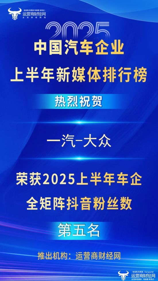 一汽-大众列“2025上半年知名车企全矩阵抖音粉丝数”第五名!