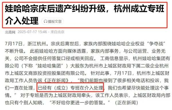 7月17日,杭州市上城区财政局工作人员向媒体表示,由于接到了很多相关电话和投诉,已(成立)专班介入处理。虽然并未明确具体要处理哪些问题,但娃哈哈的股权遗留能否解决,宗家是否涉嫌掏空国资再度成为了公众关注的焦点。