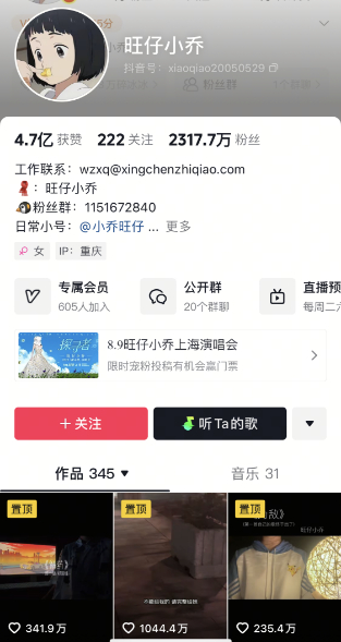 据悉,8月9日,网红“旺仔小乔”将在上海举办首场个人演唱会,演出将以不露脸的形式进行。最低票价为268元,最高票价968元。