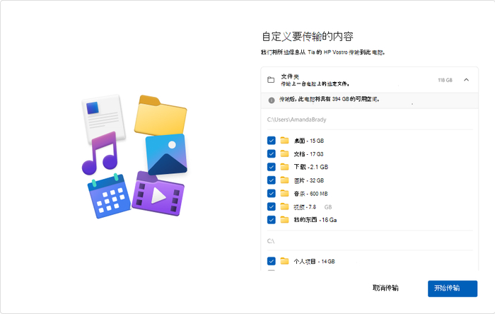 注意: 如果新电脑的存储空间比上一台电脑少,则必须取消选择某些文件或文件夹以适合可用空间,然后才能继续作。