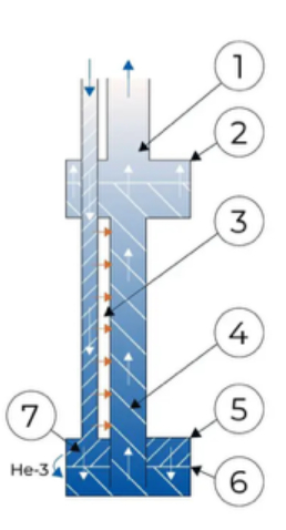 图 1.稀释-冰箱冷却循环有多个阶段:1.富氦-3气相,2.蒸馏器,3.热交换器,4.氦-3-贫相,5.混合室,6.相分离,7.富氦-3相。(图片来源:Bluefors OY/芬兰)