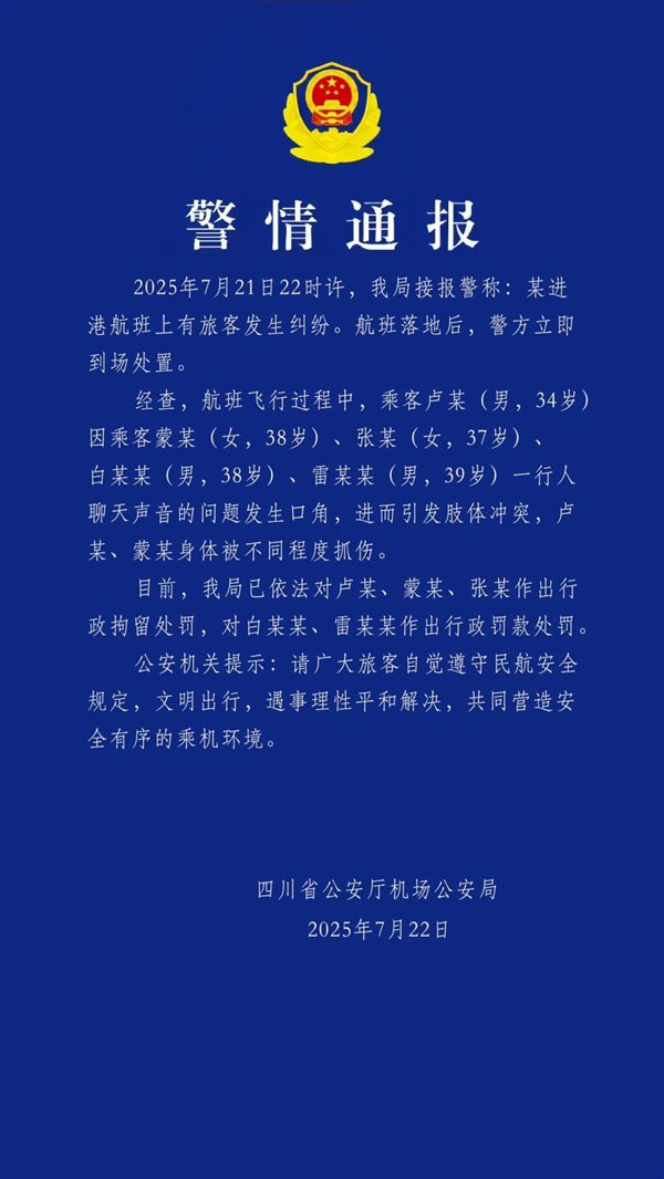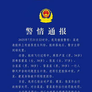 2025年7月21日22时许,我局接报警称:某进港航班上有旅客发生纠纷,航班落地后,警方立即到场处置。
