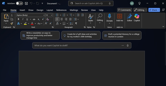 [新增功能] 在 Word 文本操作中使用 Draft with Copilot,用户可以快速将任何识别的文本转换为完整草稿。