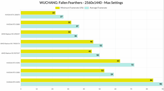 在1440p/最高画质设置下,能够流畅运行《明末:渊虚之羽》的显卡只有RTX 4090和RTX 5090。