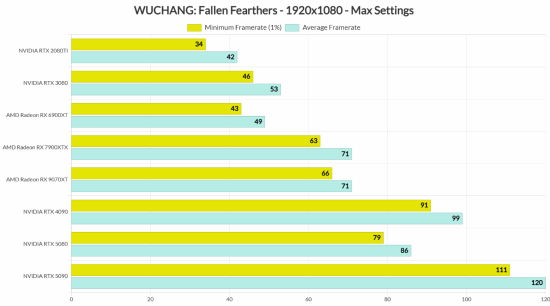 RTX 5080、AMD RX 7900XTX 和RX 9070XT的帧率始终低于60FPS。