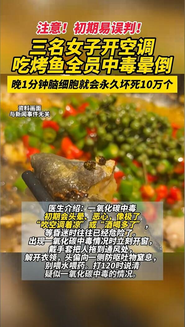 7月23日消息,据媒体报道,3名女子紧闭门窗开空调吃烤鱼,没想到4小时后全部昏迷,血液里的碳氧血红蛋白超标10多倍。