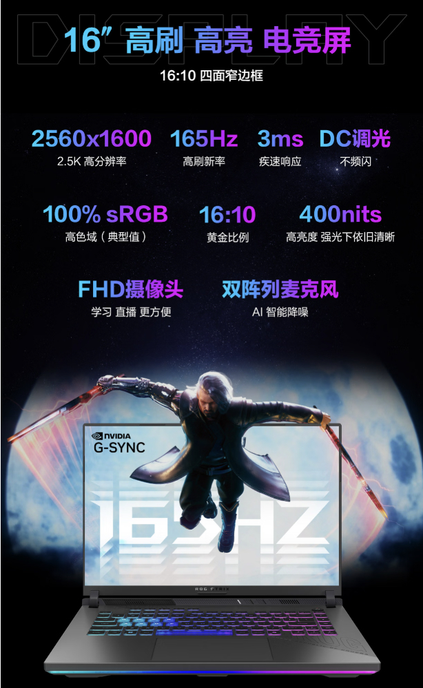 屏幕方面,配备16英寸窄边框电竞屏。2.5K高分辨率,刷新率165Hz,亮度400nits,能够满足玩家的众多游戏需求以及日常使用的需求。此外,该款产品还使用了16:10窄边框设计,玩游戏观感更沉浸。