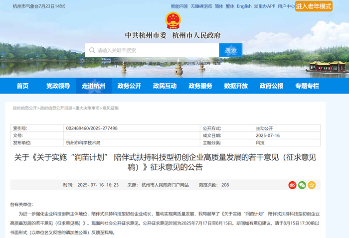 投资界(ID:pedaily2012)消息, 近日,杭州市科技局起草了《关于实施“润苗计划” 陪伴式扶持科技型初创企业高质量发展的若干意见(征求意见稿)》(以下简称《若干意见》)。现面向社会公开征求意见。《若干意见》中提出打造多元创业投资体系。聚焦“投早、投小、投长期、投人才、投硬科技”,组织设立规模为20亿元的润苗直投基金,重点为全市科技型初创企业、科技型创业团队提供早期投资乃至“第一笔投资”支持,年均投资项目数每年不少于100个,投资单个企业原则上不超过500万元。