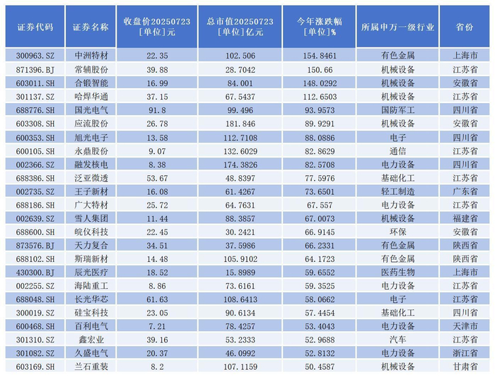 从二级市场表现看,今年以来,65家上市公司股价出现上涨,其中,24家股价涨幅超过50%,中洲特材(300963.SZ)、常辅股份(871396.BJ)、合锻智能(603011.SH)、哈焊华通(301137.SZ)4家上市公司股价成功实现**。