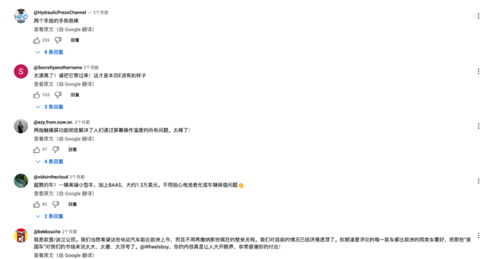 在 Youtube 和欧洲主流车媒的评测视频中,对萤火虫设计、配置的正面评价占据了主流,外国网友们主要担心的问题在于萤火虫的定位会不会受到关税的影响从而变得过高,以及目前的经销商网络能否支撑起售后上。