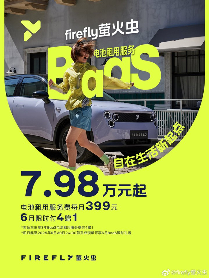 原本预算仅 8 万左右的用户可能根本不会关注萤火虫,但BAAS后,只需支付车价 8 万元,每月支付电池租金 399 元,门槛大幅降低。