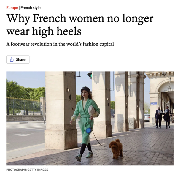 《经济学人》在一篇文章里分析,为什么连世界上最时尚的法国女人都开始不穿高跟鞋了?在欧洲,高跟鞋踩在地上的嘎哒声响,如今逐渐被橡胶鞋底的沉静所取代。