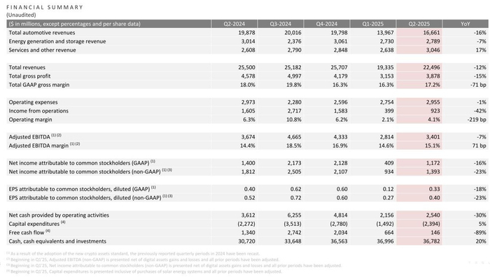 IT之家 7 月 24 日消息,特斯拉今天公布了 2025 财年第二季度财报。报告显示,特斯拉第二季度营收为 224.96 亿美元(IT之家注:现汇率约合 1613.8 亿元人民币),与去年同期的 255.00 亿美元相比下降 12%;归属于普通股股东的净利润为 11.72 亿美元(现汇率约合 84.08 亿元人民币),与去年同期的 14.00 亿美元相比下降 16%。