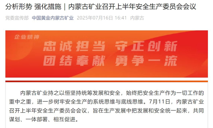 今年7月16日,“中国黄金内蒙古矿业”微信号发文称,7月11日,内蒙古矿业召开上半年安全生产委员会会议,旨在生产发展中把发展和安全统一起来,共同谋划、一体部署、相互促进。