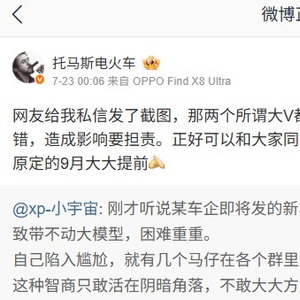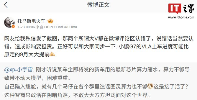 IT之家 7 月 24 日消息,@托马斯电火车(IT之家注:微博认证为小鹏汽车副总裁)昨日发文同步了小鹏 G7 车型 VLA 上车进度,称“可能比原定的 9 月大大提前”。
