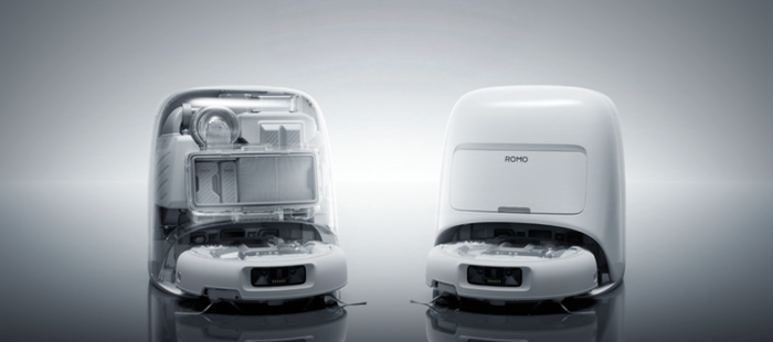 产品本身将拥有白色和透明机身两个版本。从图片可以发现,ROMO 扫地机器人的整体造型十分圆润,充电站正前方拥有类似尘盒的开关设计。透明版本的充电站可以看到内部相当多结构细节,十分精致。