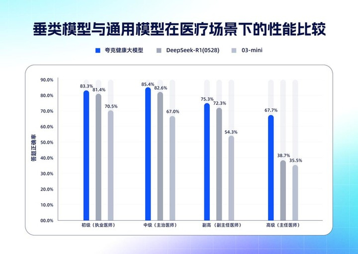 据悉,这是继 5 月通过副主任医师职称考试后,夸克健康大模型能力的又一次跃升。在垂类模型与通用模型对比中,夸克健康大模型呈现出难度越高、领先优势越明显的性能曲线,展现出在复杂医学推理任务中的突破。