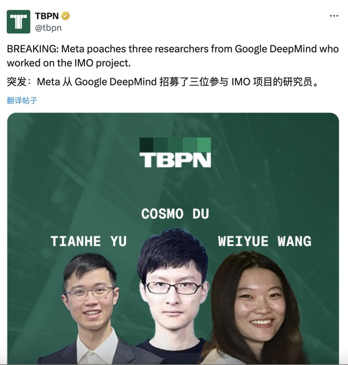 而据 TBPN 报道,「挖人狂人」Meta 近日将魔爪伸向了 DeepMind 团队——三名负责 IMO 项目的核心研究员被 Meta「抓走」了,并且又是华人。