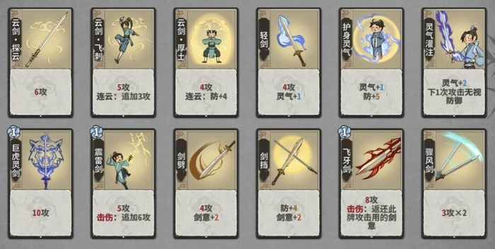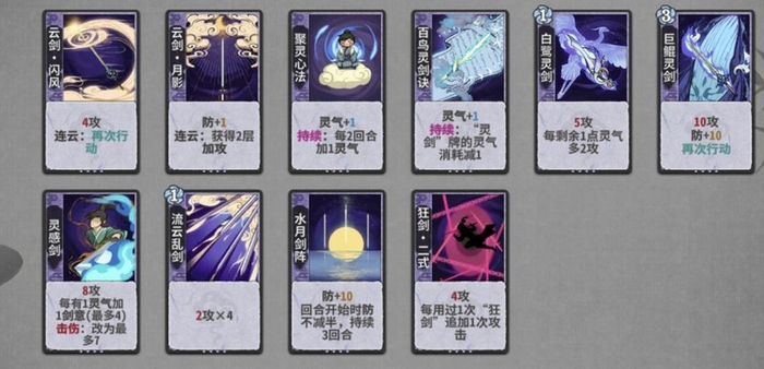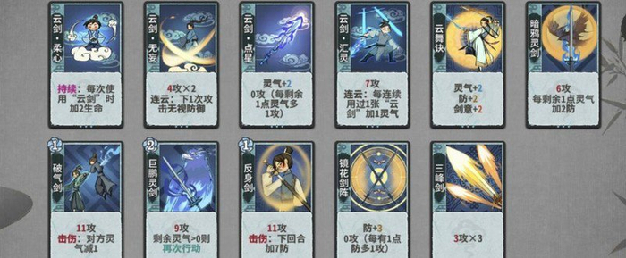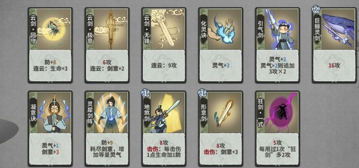 化灵诀:比常规灵气卡多出1点灵气。考虑到云剑过渡时不需要使用炼气阶段的灵气卡,因此云剑的过渡通常从筑基阶段开始。由于剑宗拥有鲲剑、鹏剑这类高消耗但可再动的技能,刚好能弥补多出的那一点灵气差,使得在过渡阶段可以放置两张灵气卡。作为筑基阶段的主力灵气卡完全可行,到了金丹阶段,虽然有云剑汇灵这样的强力卡牌出现,但化灵诀配合鲲剑或鹏剑,作为辅助灵气卡依然表现出色。