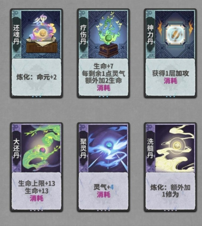 锻体丹:以前觉得还不错,但现在大多数情况下都会直接丢弃(尤其是元婴期之前)。只有在化神期之后,且丢牌次数不够时,才会在丢出锻体丹后必定吃下。后续金丹的还魂丹也是类似的处理方式。