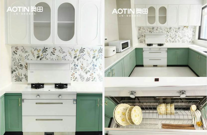 白色橱柜、绿色柜门搭配花朵墙砖,营造出清新田园氛围。奥田集成灶D3S奶白色外观与田园风格的清新自然相呼应,高效的吸油烟能力和易清洁的特点,让厨房保持干净舒适。下方大容量收纳抽屉,可规整碗碟餐具,让田园风厨房在诗意之外,兼具实用收纳功能,烟火日常也满是浪漫。