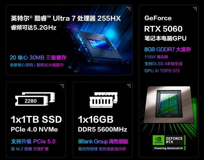 ROG魔霸新锐搭载英特尔酷睿Ultra 7 255HX处理器,全新的Arrow Lake架构,拥有20核心20线程,睿频频率可达5.2GHz,无论是大型3A游戏,还是内容创作、AI应用等,都可以轻松运行。显卡方面,则配备了115W满功耗RTX 5060 笔记本电脑 GPU,支持光线追踪、DLSS 4多帧生成,带来逼真而丝滑的游戏体验。