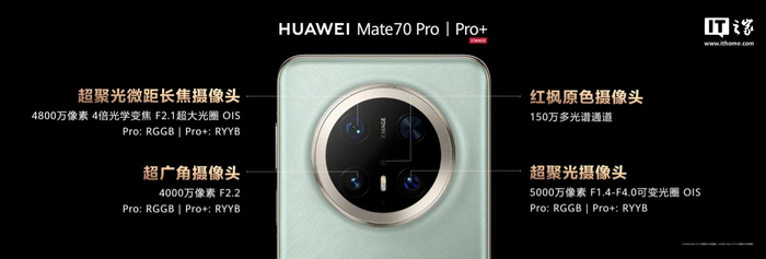 华为 Mate 70 系列主摄采用了 5000 万像素(f/1.4-f/4.0 可变光圈,OIS)、4800 万像素(4X,f/2.1 OIS)长焦镜头、4000 万像素(f/2.2,支持最近 5cm 对焦)超广角镜头,而且 Pro+ 的长焦、超广角均为 RYYB 传感器,Pro 均为 RGGB 传感器。