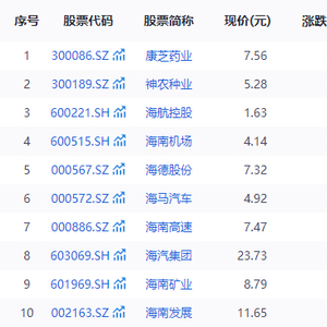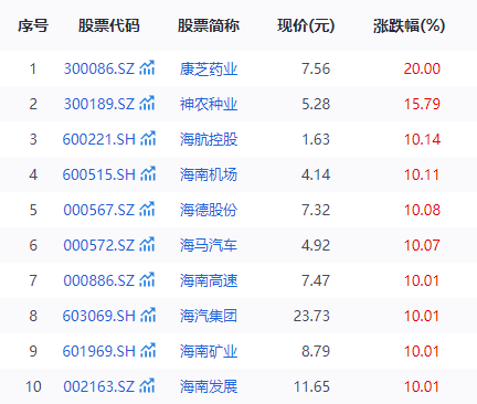 7月24日早盘,海南自贸区板块大爆发,近30只概念股全线飘红。截至发稿,康芝药业(300086.SZ)、海航控股(600221.SH)、海南机场(600515.SH)、海德股份(000567.SZ)、海马汽车(000572.SZ)、海南高速(000886.SZ)、海汽集团(603069.SH)、海南矿业(601969.SH)、海南发展(002163.SZ)、海南橡胶(601118.SH)、罗牛山(000735.SZ)、海峡股份(002320.SZ)、凯撒旅业(000796.SZ)等十余只个股悉数涨停。