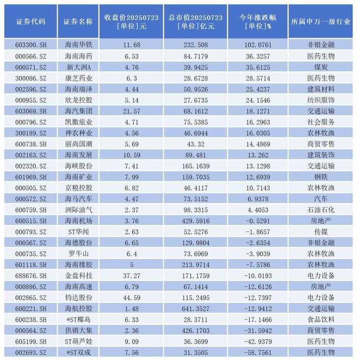 从二级市场表现看,截至7月23日收盘,今年以来表现较好的有海南华铁、海南海药、新大洲A、康芝药业、海南瑞泽、欣龙控股。其中,海南华铁股价成功实现**,遥遥领先。