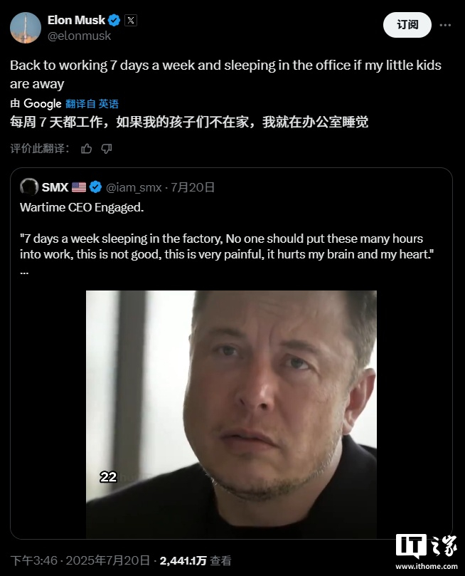 IT之家 7 月 24 日消息,本周,特斯拉和 SpaceX 的首席执行官埃隆・马斯克(Elon Musk)在其拥有的社交媒体平台 X(前身为 Twitter)上分享了自己重新回归高强度工作模式的消息。