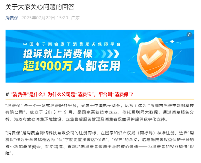 7月22日,消费保再度发布声明,强调其运营资质合法、投诉数据真实。