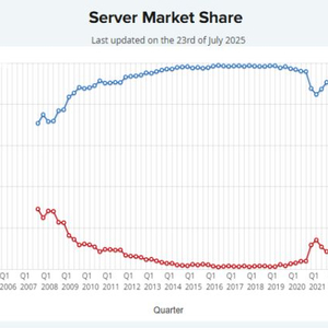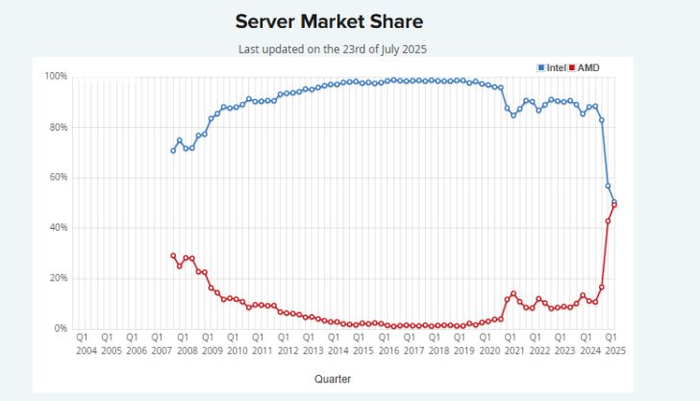 IT之家 7 月 24 日消息,科技媒体 WccFtech 昨日(7 月 23 日)发布博文,基于 PassMark 的数据,AMD 在服务器 CPU 领域迅速崛起,在 2017 年市场份额仅为 2%,而在 2025 年已经和英特尔平起平坐,市场份额达到 50%,仅用 8 年时间实现 48 个百分点增幅。