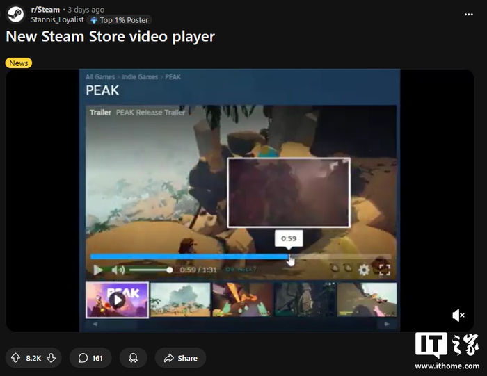 Valve 在一次更新中意外地将新播放器公之于众,很快被网友发现并保存下来。一段展示新版播放器的短视频随后出现在 Reddit 平台,视频显示新播放器采用了现代化界面,支持调整视频质量,基础功能也运行顺畅。虽然 Valve 尚未确认该播放器是否会按当前样貌正式发布,具体上线时间也尚不明朗,但其表现出的完成度已令不少玩家感到振奋。