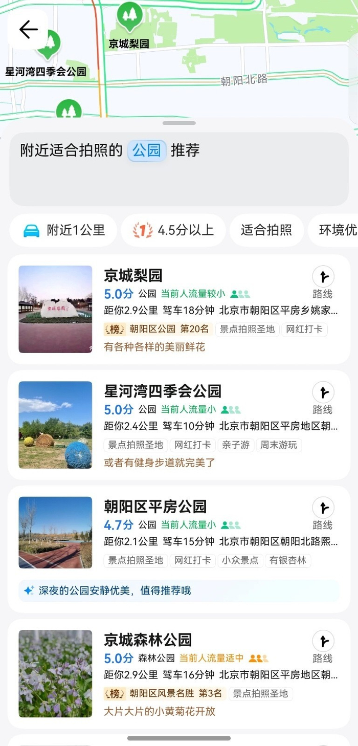 ·AI搜索:传统出行决策中,用户往往陷入“信息过载却无从选择”的困境。鸿蒙版腾讯地图新增的AI搜索功能,以自然语言理解为核心,将模糊需求转化为精准推荐。比如周末想去公园打卡出片,又不知道该选择哪里时,只需点击首页的搜索栏,根据自己的需求输入指令,AI系统便会综合地理位置、用户评价、实时人流等多维度数据为你推荐符合要求的公园。