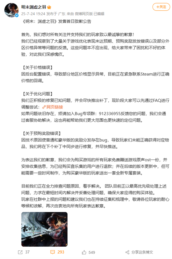 今晚,明末渊虚之羽官微发布致歉公告,称已经观察到了大量关于游戏优化表现未达预期、预购奖励发放错误以及部分外区价格异常等问题的反馈,公告具体如下: