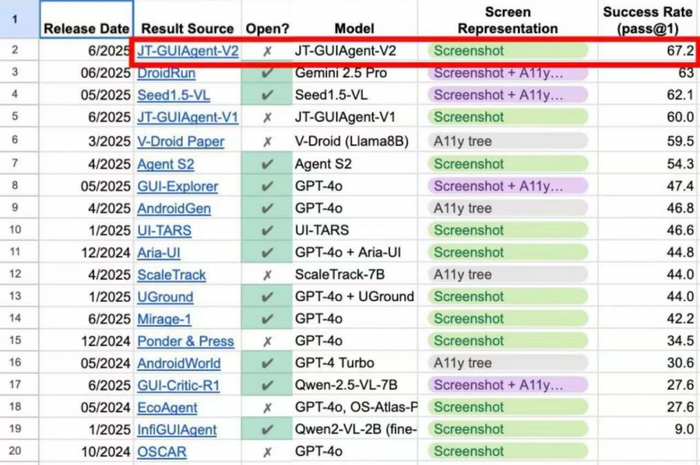 九天研究院研发的端侧自主智能体模型JT-GUIAgent-V2,在谷歌AndroidWorld自主智能体动态基准测试国际榜单中,任务成功率(Success Rate pass@1)达到67.2%,超越了基于GPT-4o、Gemini2.5、Seed1.5-VL等基座模型驱动的多个GUI Agent框架和模型,位列榜单Top1!这标志着中国移动在端侧复杂智能体系统的人机交互技术方面达到了国际领先水平。