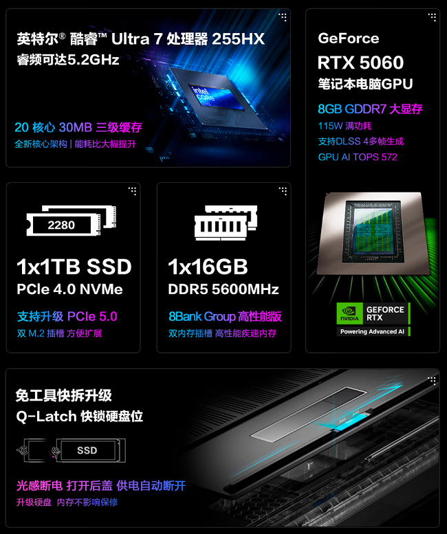 不仅具备强大的图形性能,ROG魔霸新锐2025还搭载了实力不容小觑的酷睿Ultra 7 255HX处理器,拥有8性能核+12能效核总计20核20线程,睿频可达5.2GHz,拥有66MB L2+L3缓存,还支持APO游戏加速器。存储方面配备有16GB DDR5内存+1TB PCIe 4.0 SSD实现高速数据传输,且预留有内存与固态插槽,支持PCIe 5.0的升级。值得一提的是,ROG魔霸新锐还创新性地引入免工具快拆设计,支持主板光感断电,带来更加安全便捷的升级与DIY流程体验。